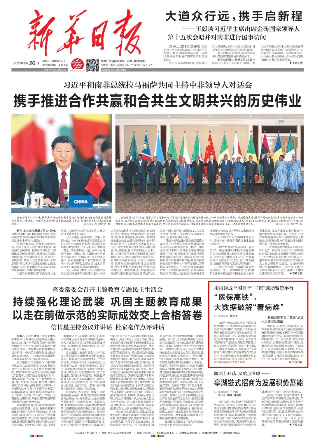 2023年8月26日,新华日报头版报道《南京建成全国首个“三医”联动监管平台—“医保高铁”大数据破解“看病难”》。