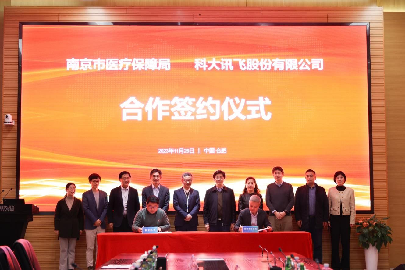 11月28日,南京市医疗保障局党组书记、局长、一级巡视员刁仁昌一行赴科大讯飞总部开展交流,并出席合作签约仪式。南京市医保中心主任钱国荣和科大讯飞惠及智医公司总经理李磊,分别代表南京市医疗保障局和北京惠及智医有限公司签署合作协议,共同打造“南京医保人工智能实验室”。